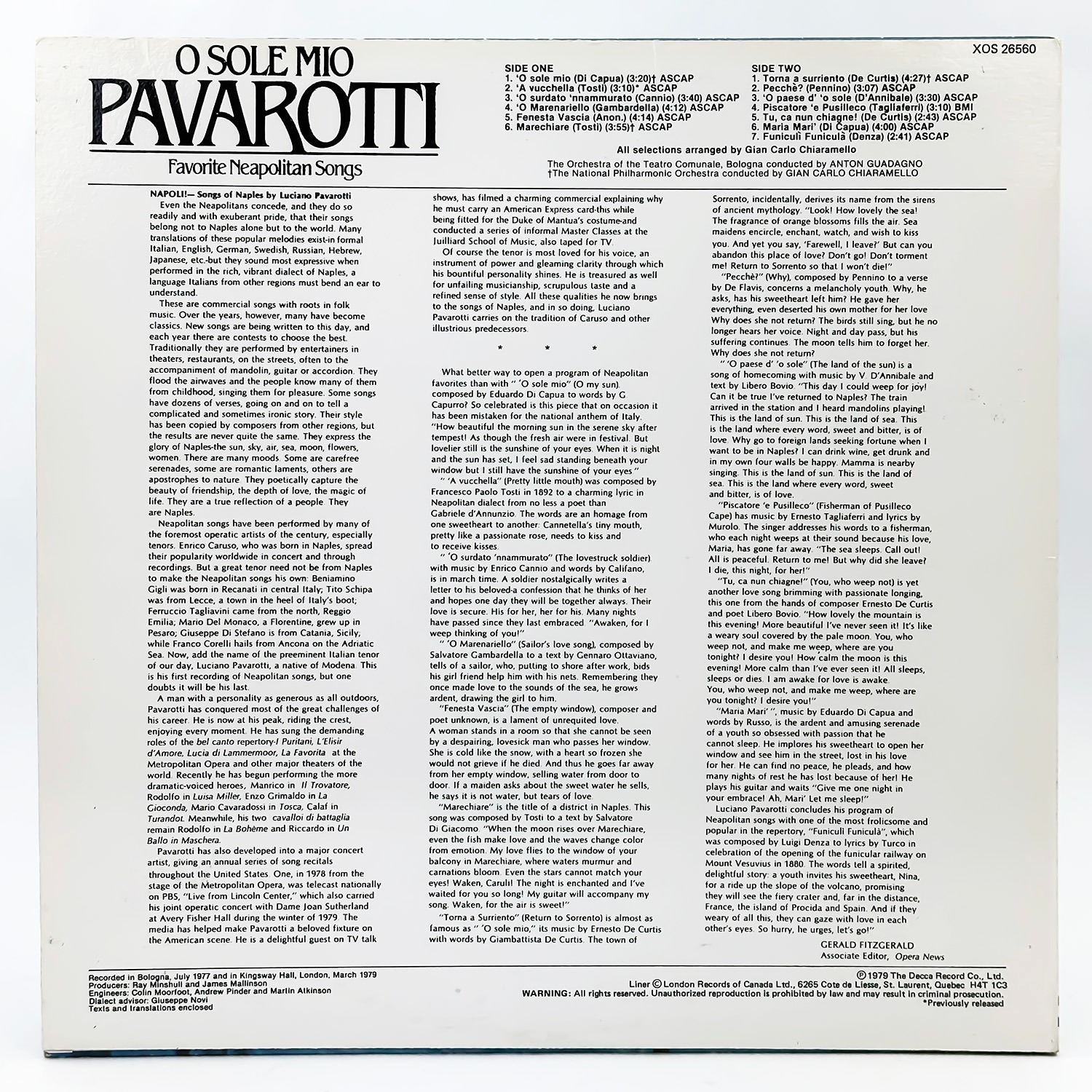 #9573 - FROM PRIVATE COLLECTION OF CLASSICAL/OPERA RECORDS. VINYL LP RECORD ALBUM. CLASSICAL, OPERA, ROMANTIC. FAVORITE NEAPOLITAN SONGS. LONDON RECORDS XOS 26560