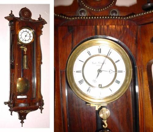 LUD. GAINZ OF PRAG. MINIATURE TIME ONLY VIENNESE STYLE; FRENCH WALNUT VENEER. 29.5"X10.25"X5.5". VALUATION: 650-800 USD.