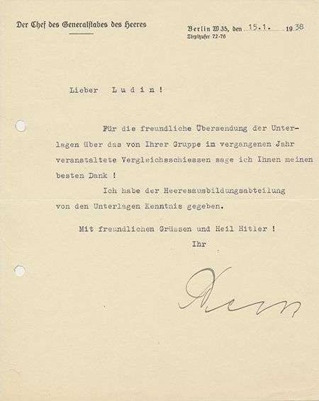 (1880 - 1945) Chief of the General Staff of the German Army, resigned in 1938 in protest of Hitler's decision to take Czechoslovakia. Beck joined the resistance, was implicated in the July, 1944 bomb plot, and was executed in his office after two suicide attempts. Rare T.L.S. on his official letterhead, 1p. 4to., Berlin, Jan. 15, 1938 to "Ludin": "Thank you for sending the documents...regarding the shooting competition...I shall pass the documents on to the army education department...". File holes at left, else fine.