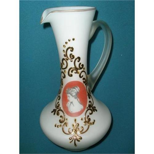 We present to you this incredible, very rare,and highly collectable MOSER PORTRAIT PITCHER. Showing satin finish in opalescent cased glass-hand painted portrait with extreamly heavy gold gilt.Nicely applied frosted satin glass handle,smoothed pontil.Its interesting as to where the handle is positioned for pouring-both elaborate designs can be seen when in use.