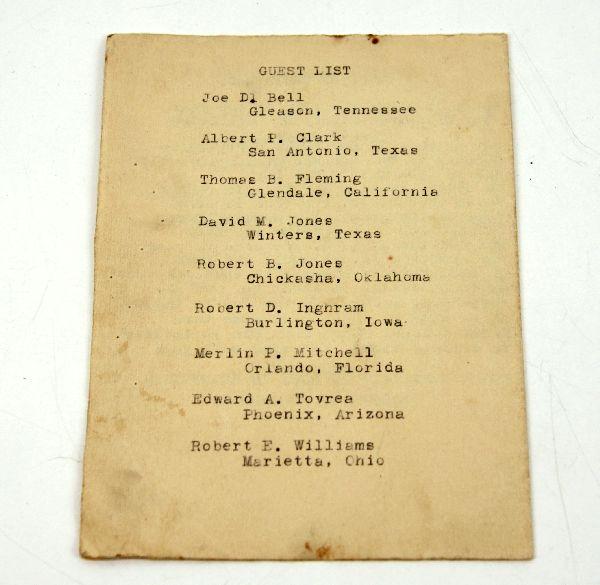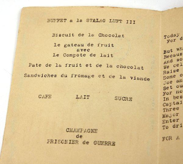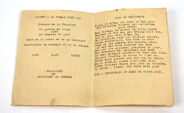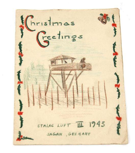 A amazingly still clear, legible and intact in overall very good condition original Christmas card from Luft Stalag III, 1943 Sagan, Germany. 100% hand drawn showing "Goon Tower", inside a comical menu, and poem referencing the select invitees. On the reverse, the names of the select Americans invited to the 1943 "Soiree". Several were heavily involved with tunnel construction including Ed Tovrea, but also David "Davy Tokyo"Jones, not only a formal member of Stalag III escape committee but also a crew member on the Doolittle raid from the book and film "30 Seconds Over Tokyo". He spent approximately a year and a half at the Sagan camp. Card measures 6.4 inches.