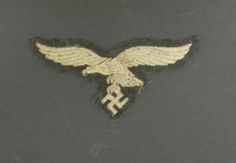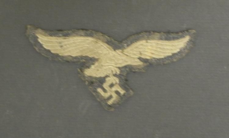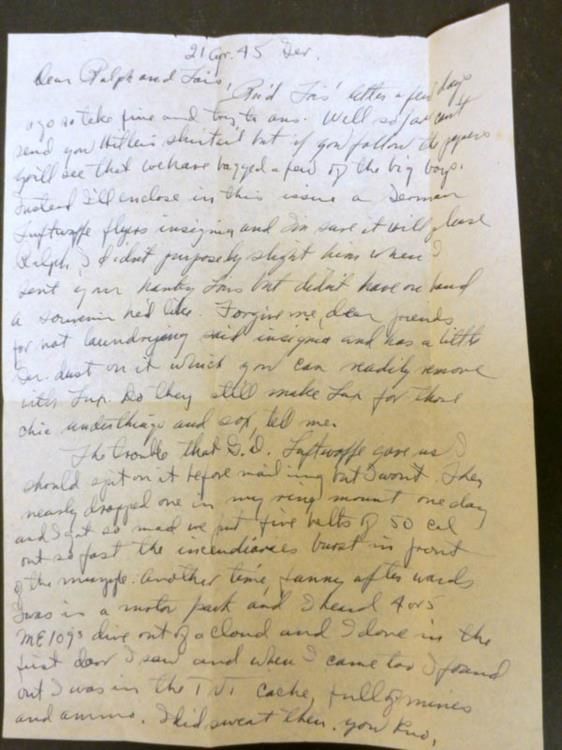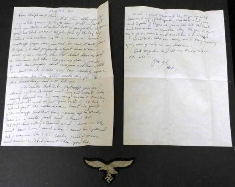 HERE IS A LUFTWAFFE BREAST INSIGNIA & 2 PG LETTER STATING HE SENT INSIGNIA & WAR STORIES. 2 PAGE LETTER DATED "21 APRIL 1945-GERMANY"--STATES THE NAZI LUFT GAVE HIM MUCH TROUBLE AND HE SHOULD HAVE SPIT ON THE EAGLE HE SENT THEM-NAZISNEARLY DROPPED ONE ON HIS GROUP-HE WAS SO MAD HE PUT 5 BELTS OF 50 CAL THAT THE INCENDIARIES BURST IN FRONT OF HIM--ALSO RE: 4 OR 5 ME109'S DIVE OUT OF THE CLOUDS--ALSO MINES AND AMMO STORY--GREAT ORIGINAL HARD TO FIND GROUPING--
