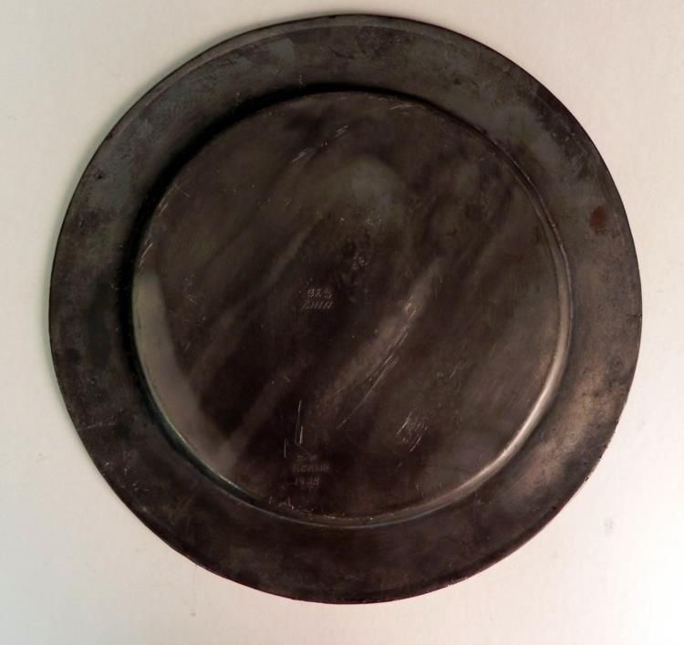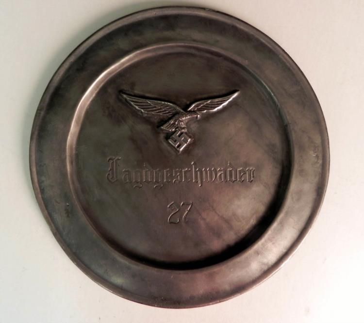 NAZI LUFTWAFFE "JAGDGESCHWADER27" JG27 FIGHTING SQUADRON 11 1/2" ENGRAVED PLATE---PRESENTATION METAL ENGRAVED LUFTWAFFE PLATE.-11 1/2" IN DIAMETER-HAS A LARGE RAISED LUFTWAFFE EAGLE AND SWASTIKA IN THE CENTER AND A NICELY ENGRAVED "JAGDGESCHWADER 27" BELOW--JG27 WAS A FAMOUS LUFTWAFFE FIGHTER SQUADRON, NICKNAMED "AFRIKA" FOR ITS SERVICE IN NORTH AFRIKA SUPPORTING THE DEUTSCHES AK.--IT WAS FORMED ON 1 OCTOBER 1939 AND FLEW MESSERSCHMITT BF 109 AIRCRAFT--REVERSE OF PLATE HAS ARTISTS INITIALS AND BERLIN AND DATED 1939--ALSO INDICATED THAT IT IS PEWTER