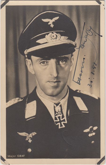 A group of five items by Knight's Cross holders, includes: HERMANN GRAFF, awarded Oak Leaves, Swords and Diamonds with over 200 victories, fine original vintage Hoffmann real photo postcard in uniform, boldly signed adding date Mar. 31, 1943. Mounting traces to corners, else fine; WILHELM JOHNEN, S.P. 4" x 6" b/w on printed stock, in uniform showing him smiling from the cockpit of his plane, signed at bottom right adding rank, along with a T.L.S. 1p. 4to., Donau, May 9, 1984, on his personal letterhead in German to a gentleman in Virginia discussing his book Duel Under the Stars, "...an account of my experiences in the German Night Fighter units. The book was published in America with the title 'Battling the Bombers'..."; HELMUT WICK, awarded Oak Leaves, an original vintage photo 4" x 6" sepia, showing him in uniform and signed on a darker portion of the image. Contrast just good. Together with ERNST BORNGEN, S.P. 4" x 6" b/w, showing him in uniform with A.N.S. (and signature) on verso: "Thanks for your letter. With cordial greetings & Horridoh [the German fighters' battle cry] Ernst Borgnen Major (Ret.) Commander II & I Jagdgeschwader 27". Very good condition, five pieces.