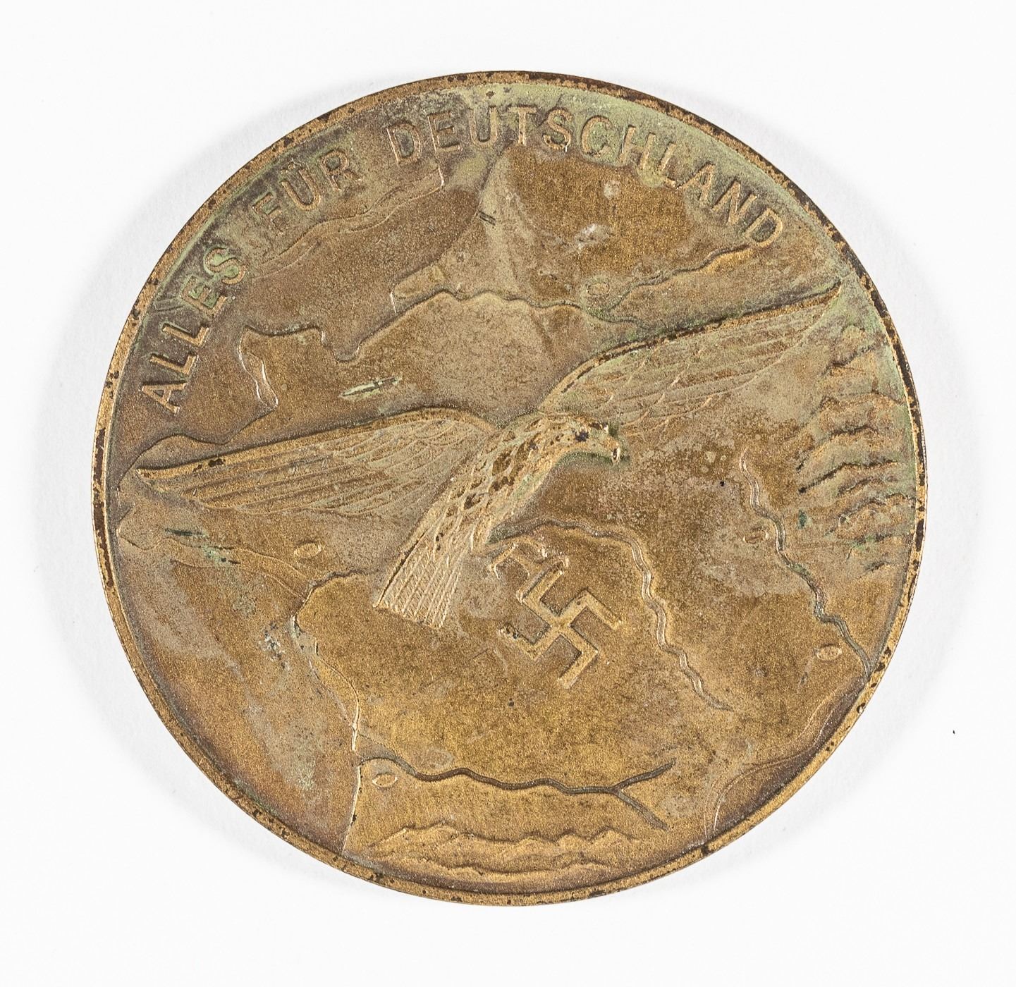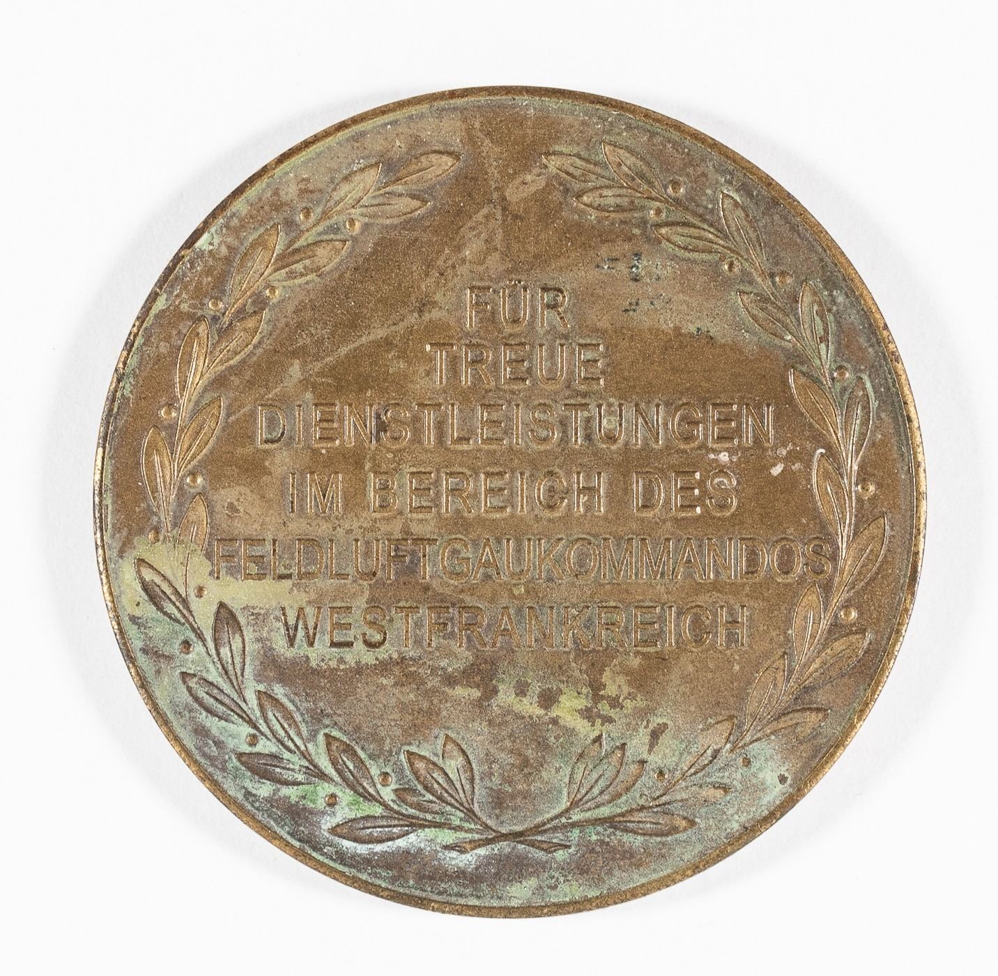 German WWII table medal 'For loyal Service in the Field Air District Command Western France' (Fur Treue Leistungen im Bereich des Feldluftgaukommandos Westfrankreich). The obverse shows a Luftwaffe eagle clutching a swastika in his talons, with 'Everything For Germany' (Alles Fur Deutschland). Approx. 1.5 inches. Some oxidation on verso.
