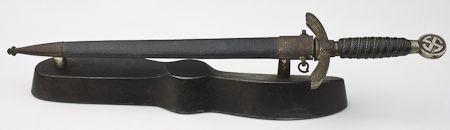 Miniature Luftwaffe 1st pattern dagger, 10 1/4" long, the chromed steel blade bearing Alcoso maker's marking, original blue leather grip wrapped with wire, with blue leather-covered scabbard which is factory-mounted atop a solid steel base in the shape of a propeller. Leather intact, fittings quite oxidized, still a very uncommon item.