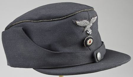 Non-regulation Luftwaffe officer's visored cap, blue twill cotton with a bullion eagle and Luftwaffe tri-color emblem hand-stitched to the front, with bullion piping. Interior shows light wear but is soiled entirely consistent with use.