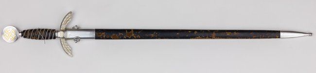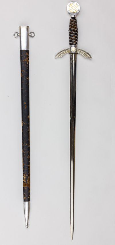 Luftwaffe sword with aluminum fittings which are in excellent condition but grip and scabbard in need of repair or replacement. The swastikas on the pommel retain almost all of their original gold tone and luster, as does the cross guard where all of the detailing on the feathers remains undamaged. The double wire-wrapped grip, probably a replacement, shows damaged leather and a break to one of the wires.The 26 1/4" blade is marked by maker Paul Weyerberg & Co. and remains in excellent condition with virtually no running marks. The fittings to the scabbard are fine, but the leather is heavily chipped and scratched. A "project" sword, estimated accordingly.