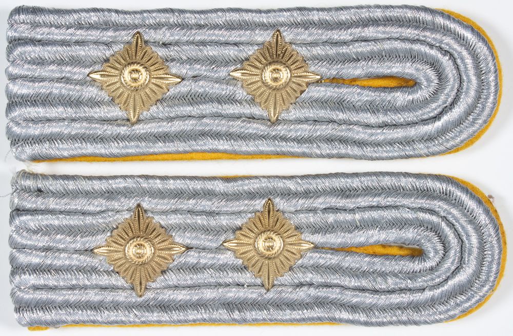 Pair of Luftwaffe captain's shoulder boards, silver bullion on yellow felt backing, two pips, with button attachments. In fine condition.