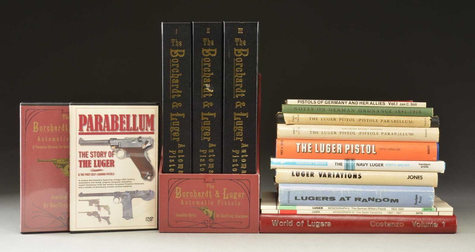This lot consists of 13 books mostly on Lugers & mostly hardcover. 1-3. The first three books are volumes 1-3 of The Borchardt & Luger Automatic Pistols A Technical History for Collectors from C93 to P.08 by Joachim Gortz & Dr. Geoffrey Strugess. These books also include a case which shows a tear. Also included are two CDs. The books show some light dust staining. 4. the fourth book is The Luger Pistol by Fred Datig.This book shows moderate wear to the dust jacket. 5 and 6. the fifth & sixth books are a different edition of The Luger Pistol by Fred Datig w/ a WW2 German soldier on the cover. These books show a couple tears, crazing & creasing on the dust jacket. 7. The Seventh book is World of Lugers Proof Marks Volume 1 by Sam Costanzo. The inside of the book has a personalized signature from the author. The book shows moderate shelf wear. 8. The eighth book is a softcover Monograph IV: The Swiss Variations 1897-1947 by Fred Datig. This book shows light scuffing & shelf wear. The ninth book is a softcover Monograph II: The German Military Pistols 1904-1930. This shows light shelf wear. 9. the ninth book is Lugers at Random by Charles Kenyon. The inside of the book has a personalized signature from the author. This book shows some fraying & light tears on the dust jacket. 10. the tenth book is Notes on German Ordnance 1841-1918 by Major James E. Hicks. This book shows some shelf & age wear from the years. 11. the eleventh book is a softcover The Pistols of Germany and It's Allies In Two World Wars Volume 1 by Jan Still. 12. the twelfth book is Luger Variations Volume 1 by Harry Jones. This book shows some fraying & staining on the dust jacket. 13. the thirteenth book is The Navy Luger by Joachim Gortz & John Walter. This book shows some moderate shelf wear. (02-16954-3/MJC). $300-500.