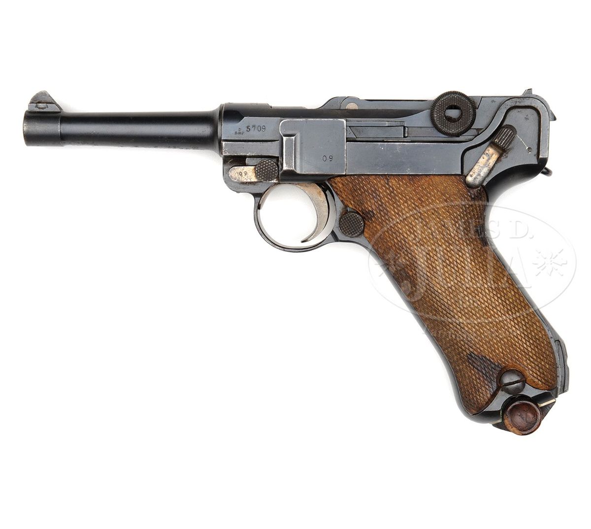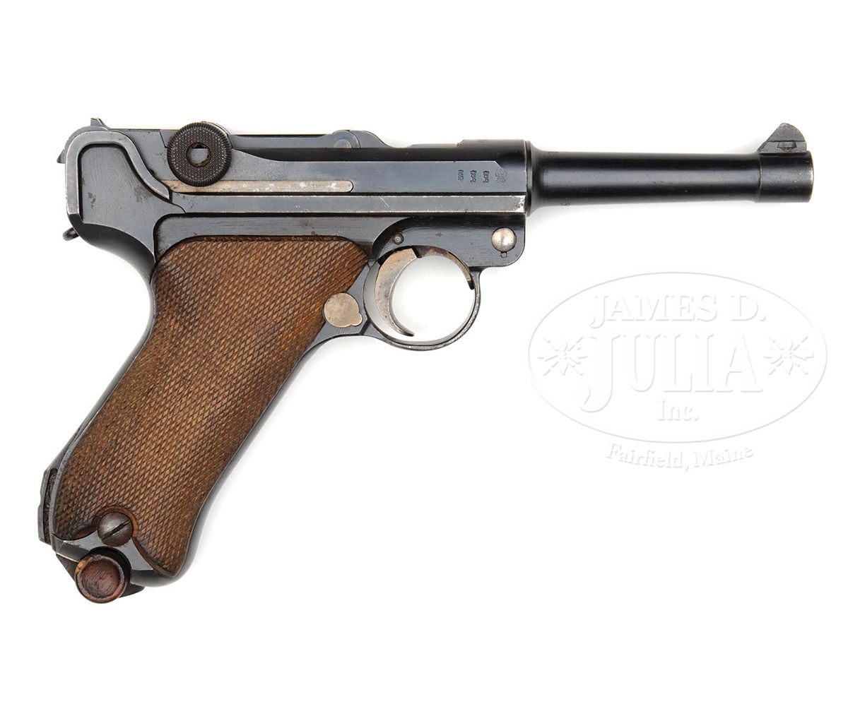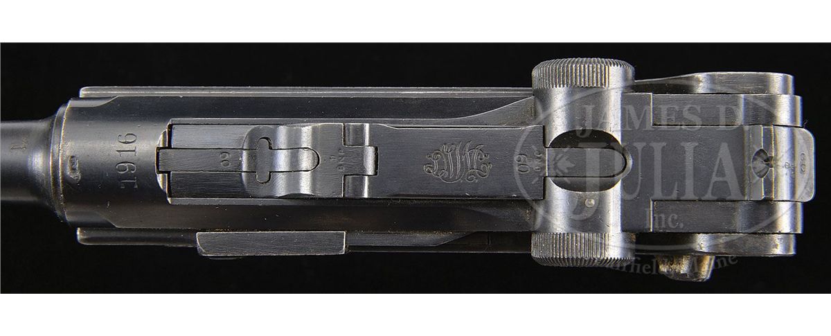 SN 5709o. 4" 9mm bbl. "1916" marked above chamber. "DWM" scroll above center toggle link. Imperial military proofs on right side of receiver. British proof marks. All numbered parts on the gun are matching. Proper wood bottom magazine does not match. This gun appears on pp. 527, 574, and 1110 in Dr. Geoffrey Sturgess' The Borchardt & Luger Automatic Pistols. PROVENANCE: Collection of Dr. Geoffrey Sturgess. CONDITION: Very fine. Retains 95% original blue and 70% original straw with scattered light pitting in a few areas. Bore has light pitting. Checkering on walnut grips is worn. Mechanics are fine. 4-52924 BWS15