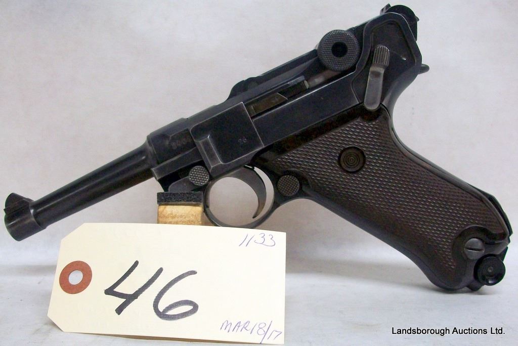PROHIBITED, SEMI AUTO, 9MM LUGER, 102MM BARREL, SN 926C. PLASTIC GRIPS GOOD, BLUING IS FADED AND GREY, BORE GOOD. MADE UP FROM SEVERAL FIREARMS, TOGGLE AND SAFETY DO NOT FUNCTION PROPERLY. COMES WITH MANUAL AND SHOULDER HOLSTER.