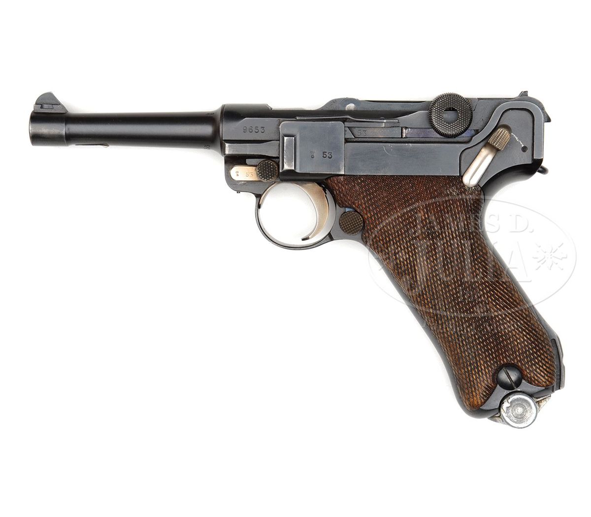 SN 9653. Police issue with sear safety. 4" 9mm bbl. "Simson & Co Suhl" marked on center toggle link. Eagle/6 proofs (shown on p. 467 of Dr. Geoffrey Sturgess' The Borchardt & Luger Automatic Pistols). All serial numbers on the gun are matching, including the checkered walnut grips which have the full four digit serial number and Eagle/6 proofs. Some internal small parts were numbered by the police arsenal. The proper aluminum bottom Simson magazine does not match. PROVENANCE: Collection of Dr. Geoffrey Sturgess. CONDITION: Very fine retaining 96% original bright blue and 85% original straw. Bore is bright with light wear. Grips are worn with indentations. Magazine is very good with a few dings in the bottom. Mechanics are sound. 4-52943 BWS4