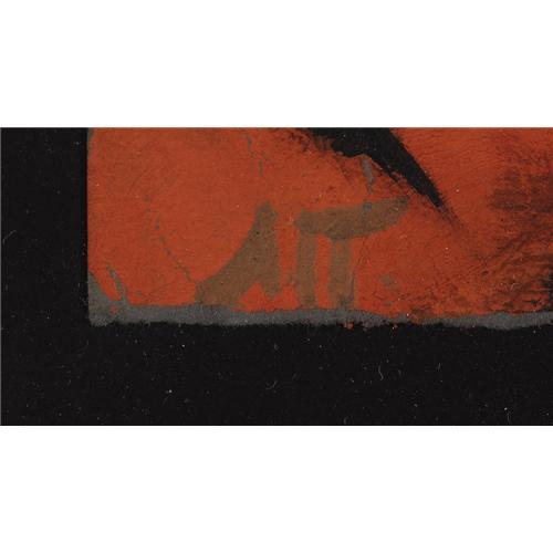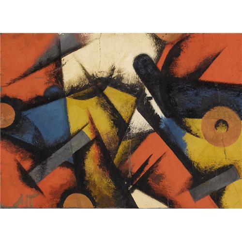<B>LUIBOV POPOVA</B></I> (Russian 1889-1924)<BR><I>Untitled</B></I><BR>Oil and gouache on paper<BR>11 x 8-7/8 inches (27.9 x 22.6 cm)<BR>Initialed lower left<BR>Stamped verso<BR><BR> <B>Condition Report:</B> slight fraying on edges, more prominent on lower edge, creasing and slight paintloss throughout<BR><BR><b>Shipping:</b> Requires 3rd Party Shipping (<a target="_blank" href="http://www.heritageauctions.com/common/shipping.php">view shipping information</a>)