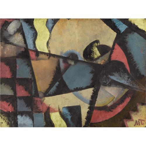 <B>LUIBOV POPOVA</B></I> (Russian 1889-1924)<BR><I>Untitled</B></I><BR>Oil and gouache on paper<BR>6-1/4 x 8-1/2 inches (15.9 x 21.6 cm)<BR>Initialed lower right <B>Condition Report:</B> minor paint loss on corners and central upper edge<BR><BR><b>Shipping:</b> Requires 3rd Party Shipping (<a target="_blank" href="http://www.heritageauctions.com/common/shipping.php">view shipping information</a>)