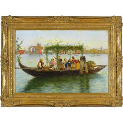 <B><BR>LUIGI PASTEGA (Italian, 1858-1927)</B></I><BR><I>A Festive Dinner</B></I>, 1904<BR>Oil on canvas<BR>24 x 36 inches (61.0 x 91.4 cm)<BR>Signed and dated lower right: <I>L Pastega / 1904</B></I><BR> <BR>PROVENANCE:<BR>Sotheby's, New York, <I>19th Century European Paintings, Drawings and Sculpture</B></I>, May 23, 1996, lot 548.<BR><BR>Venetian genre subjects of the type represented by this charming work were especially popular among American collectors in the early years of the twentieth century.