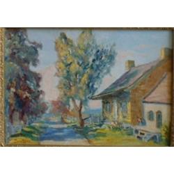 LUKE, Jane Corbus, 1881- . "A Quebec Farmhouse in Summertime". Huile sur panneau, signée. Oil on board, signed. 10" x 14" - 25.4cm x 35.5cm. $350/450
