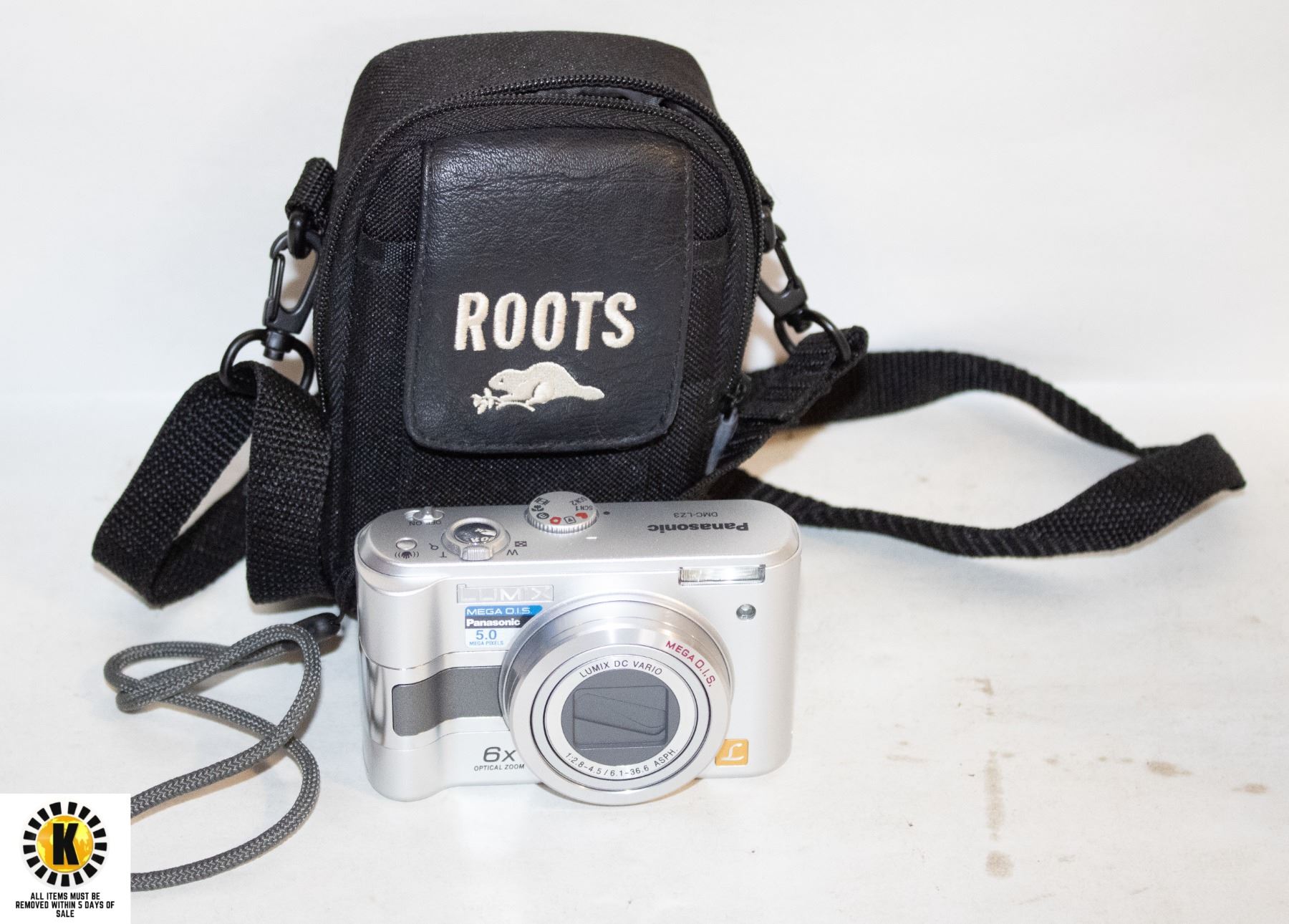 CAMERA. 5.0 MEGAPIXEL. RUNS ON 2 AA BATTERIES. SD CARD NOT INCLUDED. ROOTS BRANDED CASE WITH SHOULDER STRAP INCLUDED.