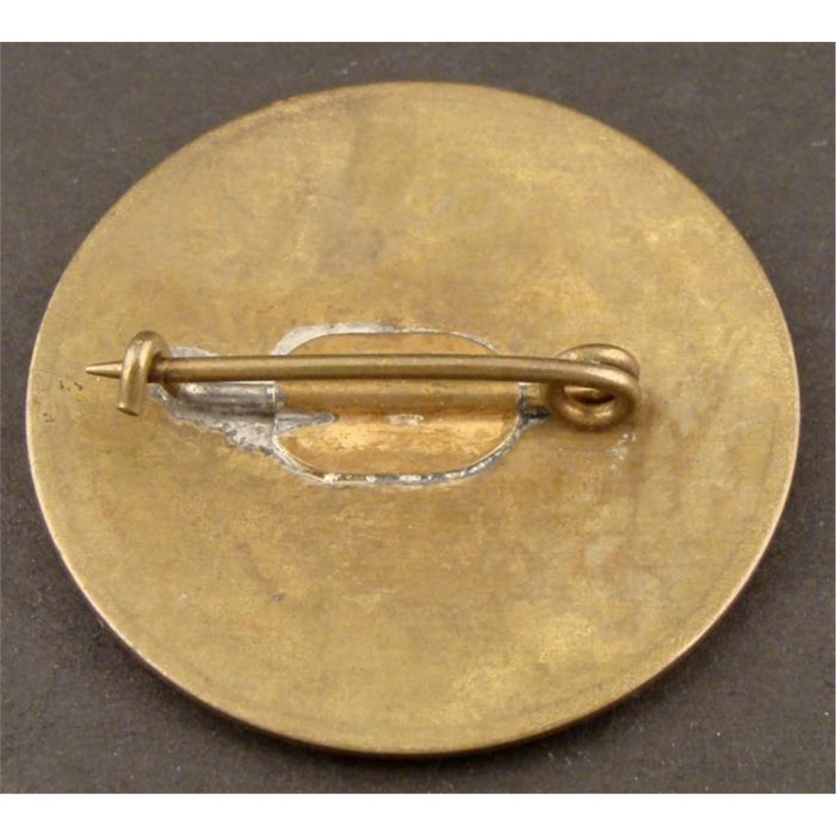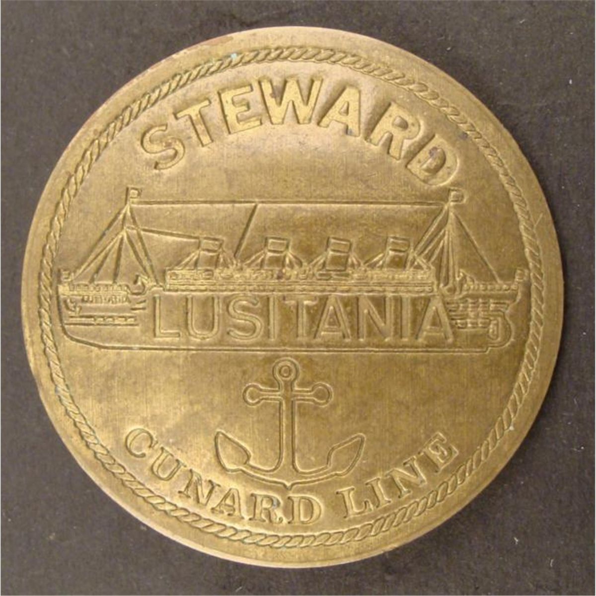 LUSITANIA-CUNARD LINE-STEWARD BADGE-SHIP & ANCHOR ETCHED IN-1 3/4"-PINBACK-BRASS * NICE PATINA ON BRASS-KNOTTED NAVAL EDGE BORDER *
