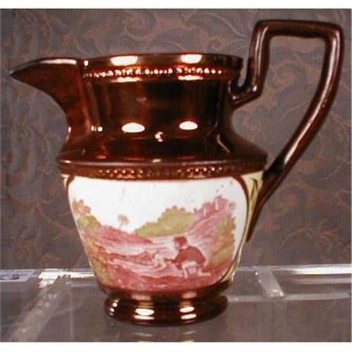 Great antique copper lustre (or luster ) ware jug with scenic transfer decorations. The