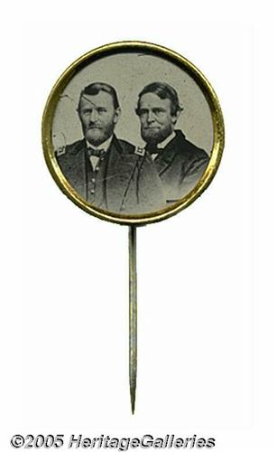<B>LUSTROUS Grant and Colfax 1868 Jugate Ferrotype Stickpin</B></I> Sullivan-DeWitt USG 1868-97, 17 mm. This jugate is a beauty with bold, sharply detailed portraits of Ulysses S. Grant and Schuyler Colfax. Condition is excellent "plus." Lot:258