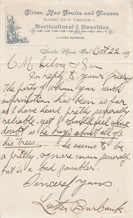 (1849 - 1926) American scientist and horticulturist who developed new strains of fruits, berries and vegetables, and the Shasta daisy as well. A.L.S. on his scarce "Olives, New Fruits and Flowers, Rare Nut Trees and Horticultural Novelties" letterhead. 1p. 8vo., Santa Rosa, Oct. 22, 1891. In part: "...In reply to your query. The party of whom you wish information has been as far as I have heard pretty generally reliable, yet I should feel some doubt as he buys about all of his trees. He seems to be a pretty square man generally, but is a bad gambler...". Slight offsetting. Sold with a second signature on a small card dated 1926 and two 5" x 7" printed portraits.