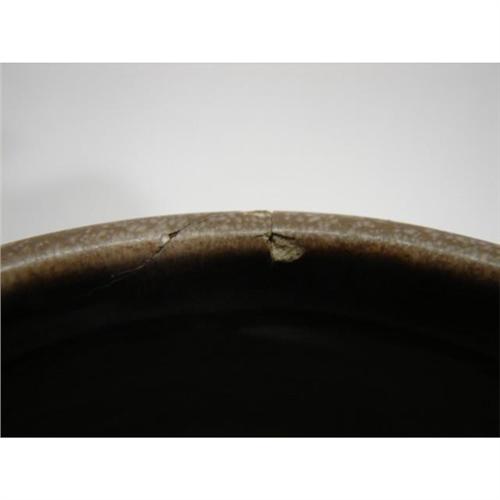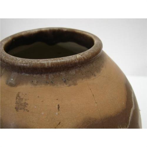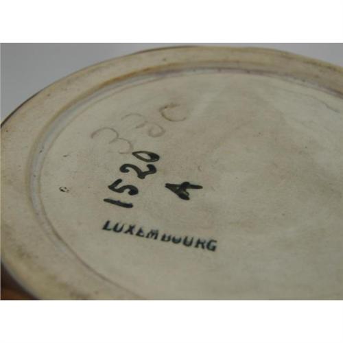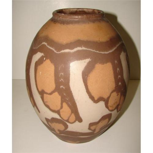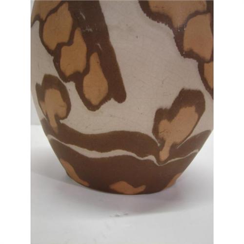 LUXEMBOURG POTTERY OVOID VASE. Decorated with tan, cream, and brown matte glaze. Shows two small cracks at top rim and a tight vertical hairline crack at top. Shows crazing throughout. Stamped on bottom “Luxembourg/330” and marked on bottom in script “1520/A”. 9.5” H