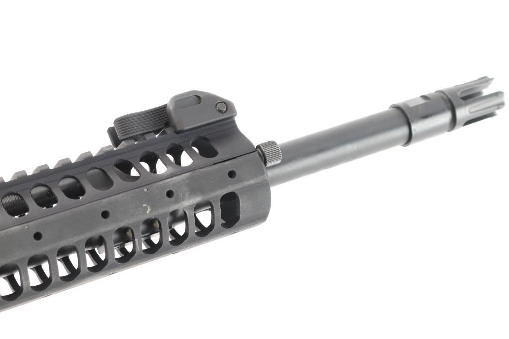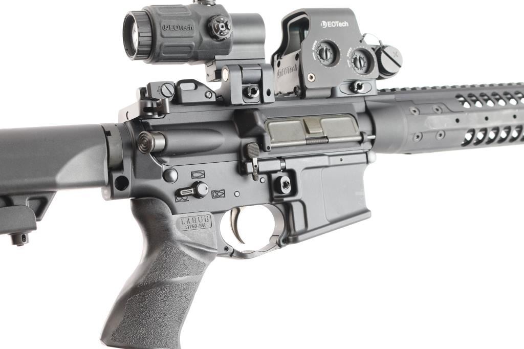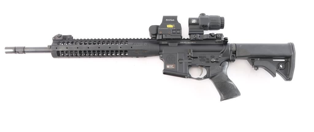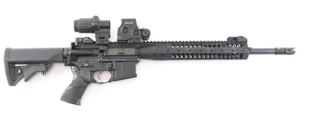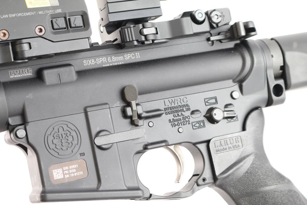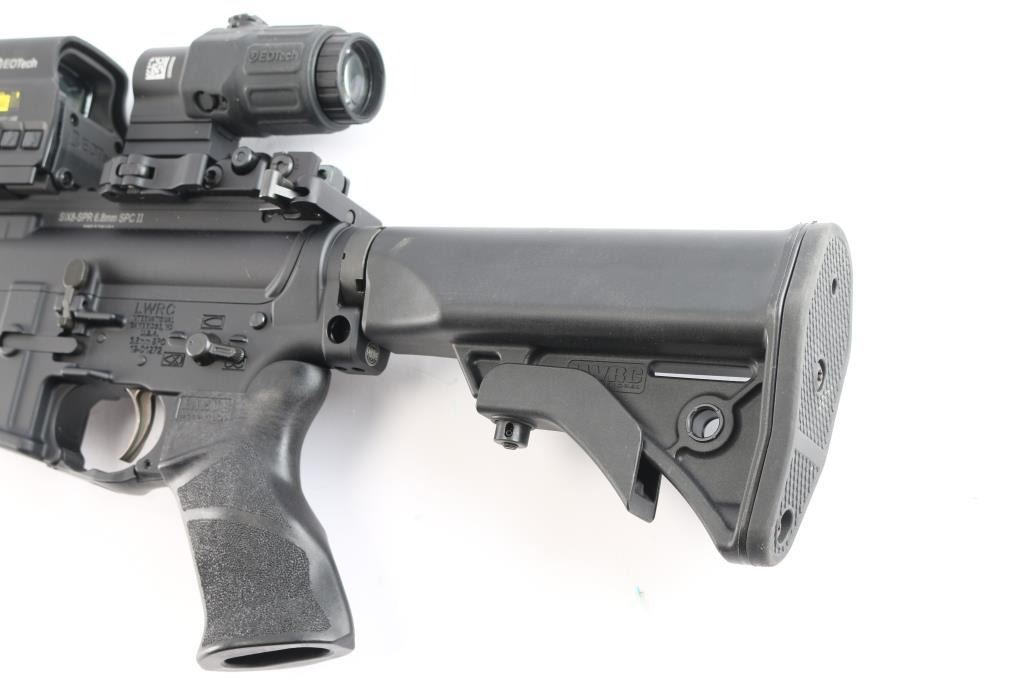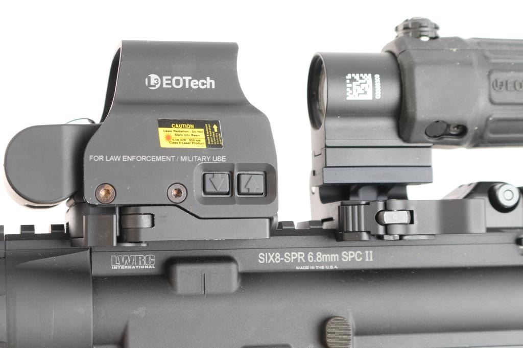 he LWRC SIX8-SPR is a high-performance semi-automatic rifle chambered in 6.8 SPC. Features a 16" cold hammer-forged Nicorr-treated heavy barrel, 1/10 RH rifling, LWRC high efficiency flash hider with aggressive end cuts, adjustable 2 position gas block, and a fully ambidextrous lower receiver. 1/10 RH rifling, LWRCI Ambidextrous charging handle, LWRCI Adjustable Compact stock, Larue textured grip, forward assist, shell deflector, California bullet mag release 12" free float handguard, full length rail mounted with LWRC flip-up sights and the EOTech L3 Holographic Hybrid Sight II EXPS-2 with G33.STS Magnifier, switch-to-side (STS) mount offers instant disengagement of the magnifier. Bore is excellent/bright, finish and furniture are excellent. No magazine