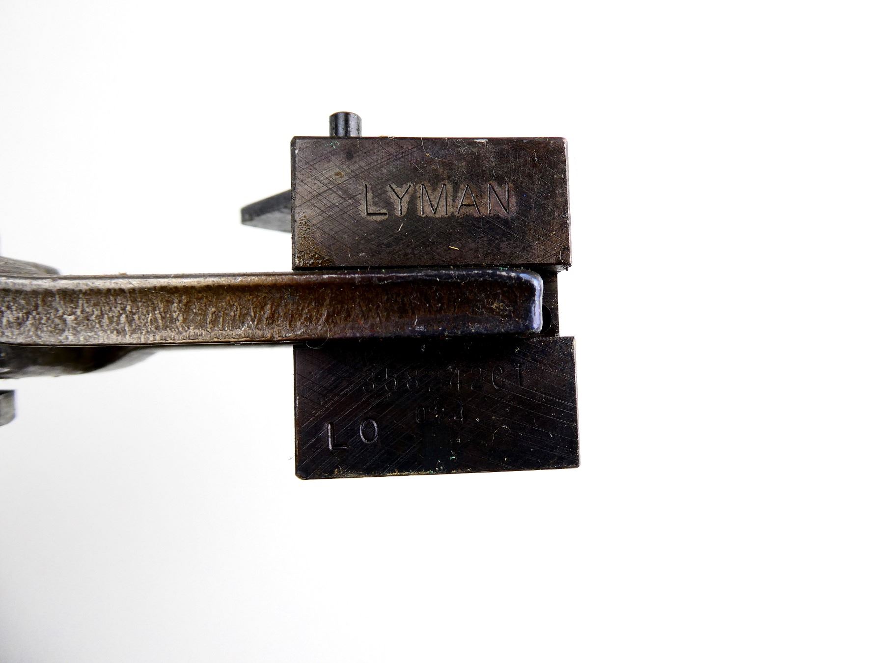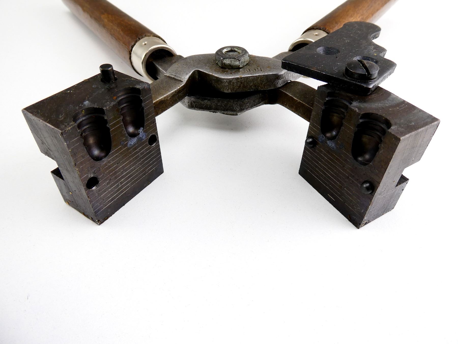 LOT INCLUDES; (1) .358 CAL. DOUBLE-CAVITY BULLET MOLD WITH WOOD HANDLES ATTACHED, MOLD MARKED: "LYMAN, 358242CT, 074". SEE PHOTOS.
