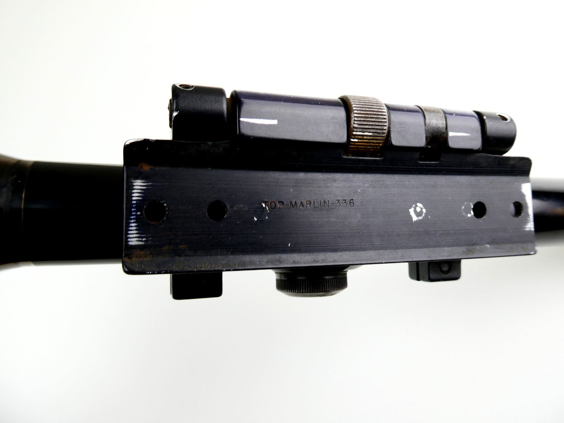 (1) CLEAR OPTICS, SINGLE POST RETICLE WITH FINE LINE, 1" TUBE DIAMETER, WORKING MAGNIFICATION RING, WINDAGE & ELEVATION KNOBS TURN, MARKED: "LYMAN ALL-AMERICAN 4X", ETC., WITH MOUNTING RAIL MARKED "TOP MARLIN 336", SHOWS WEAR & TEAR / USE MARKS. SEE PHOTOS.
