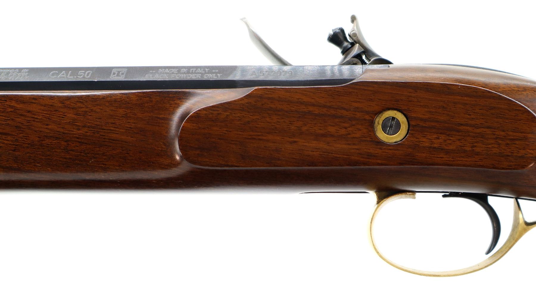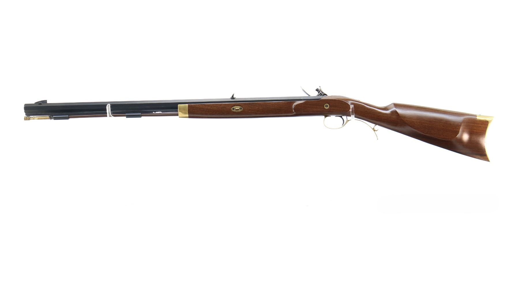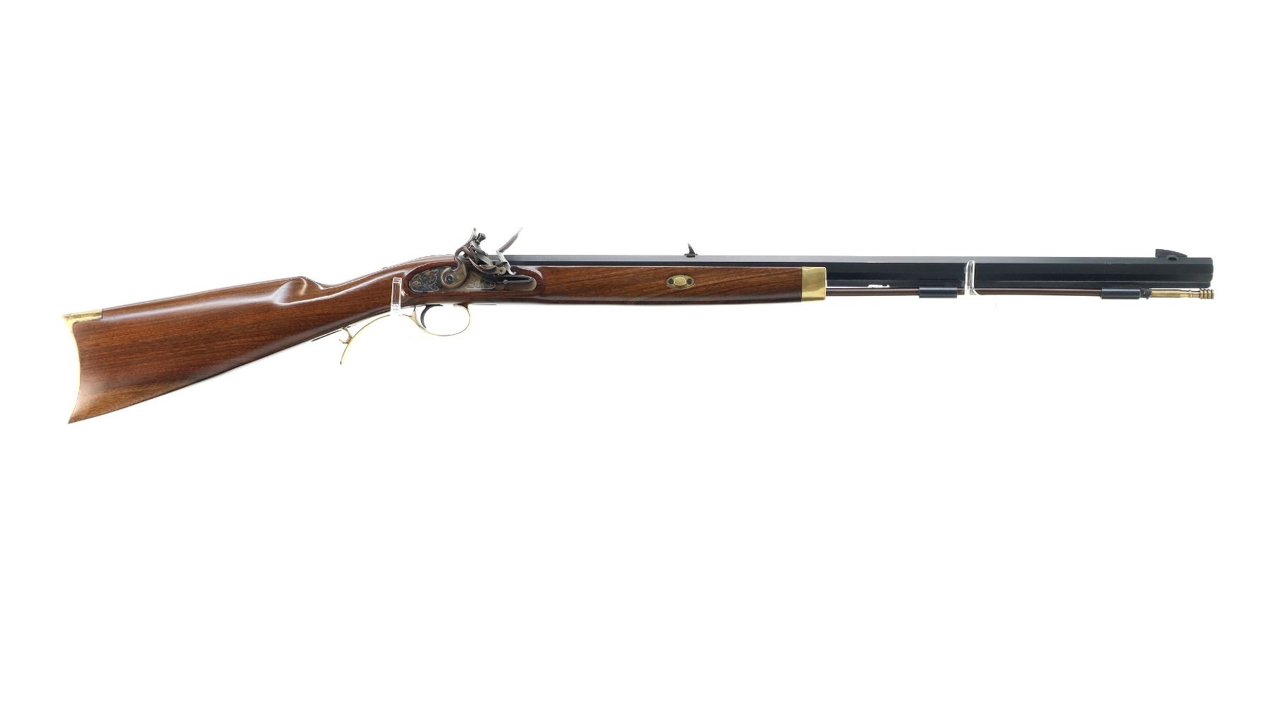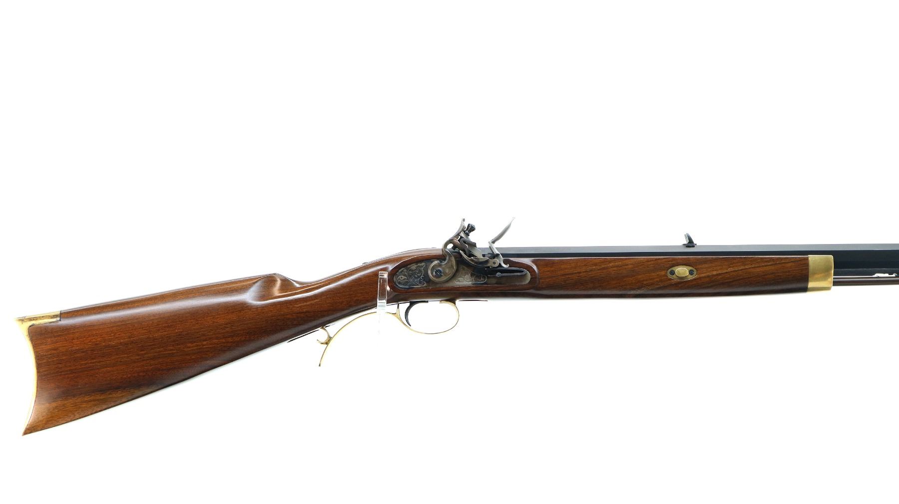Main Description: Blade front sight, u notched rear sight, blued octagon barrel, engraved colour case hardened lock with hammer and frizzen that function. One piece half length wood stock, single forearm wedge, straight grip, cheek rest, smooth curved brass butt plate, finger rest trigger guard and nose cap, brown polymer ramrod with brass tip.