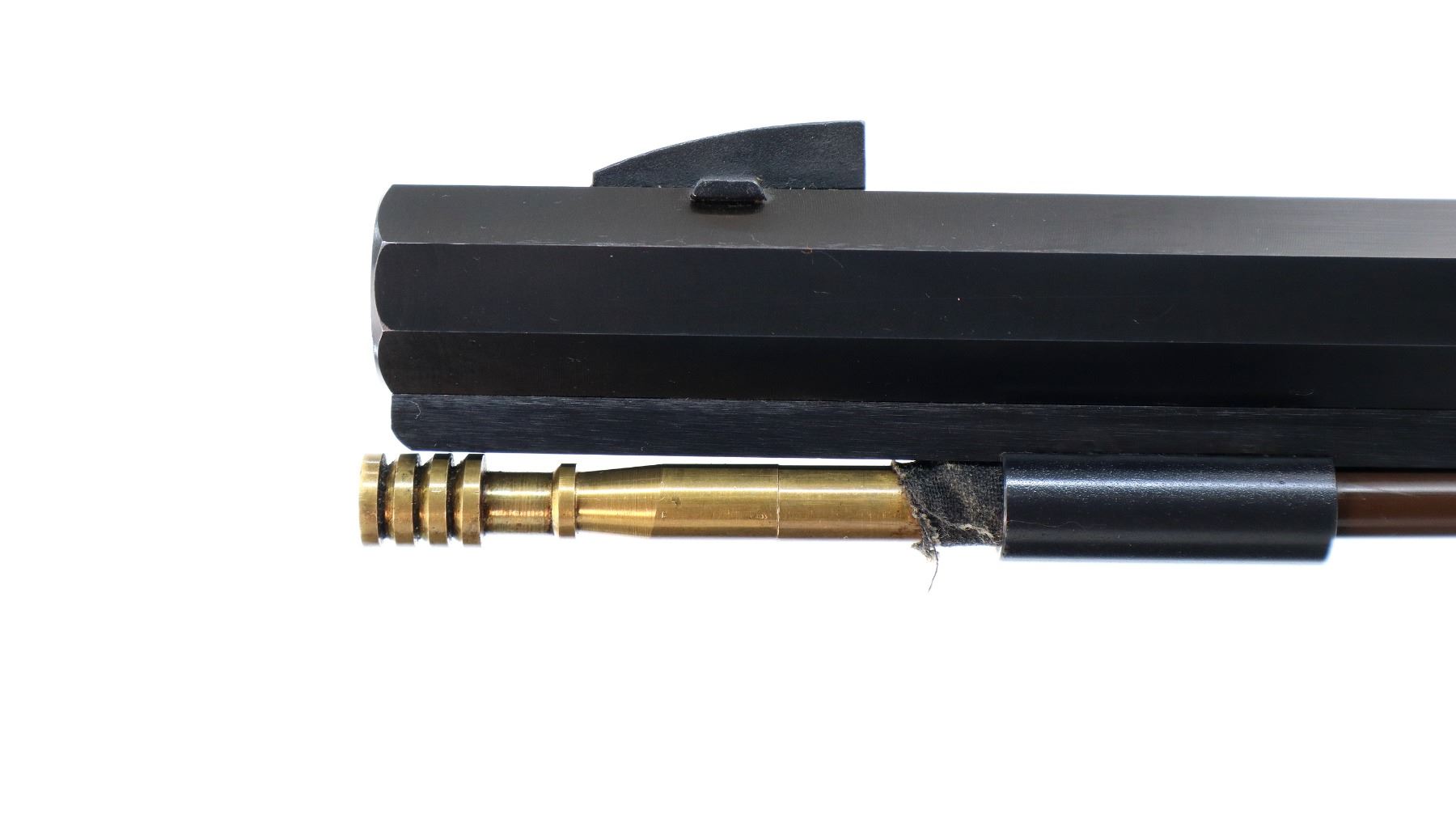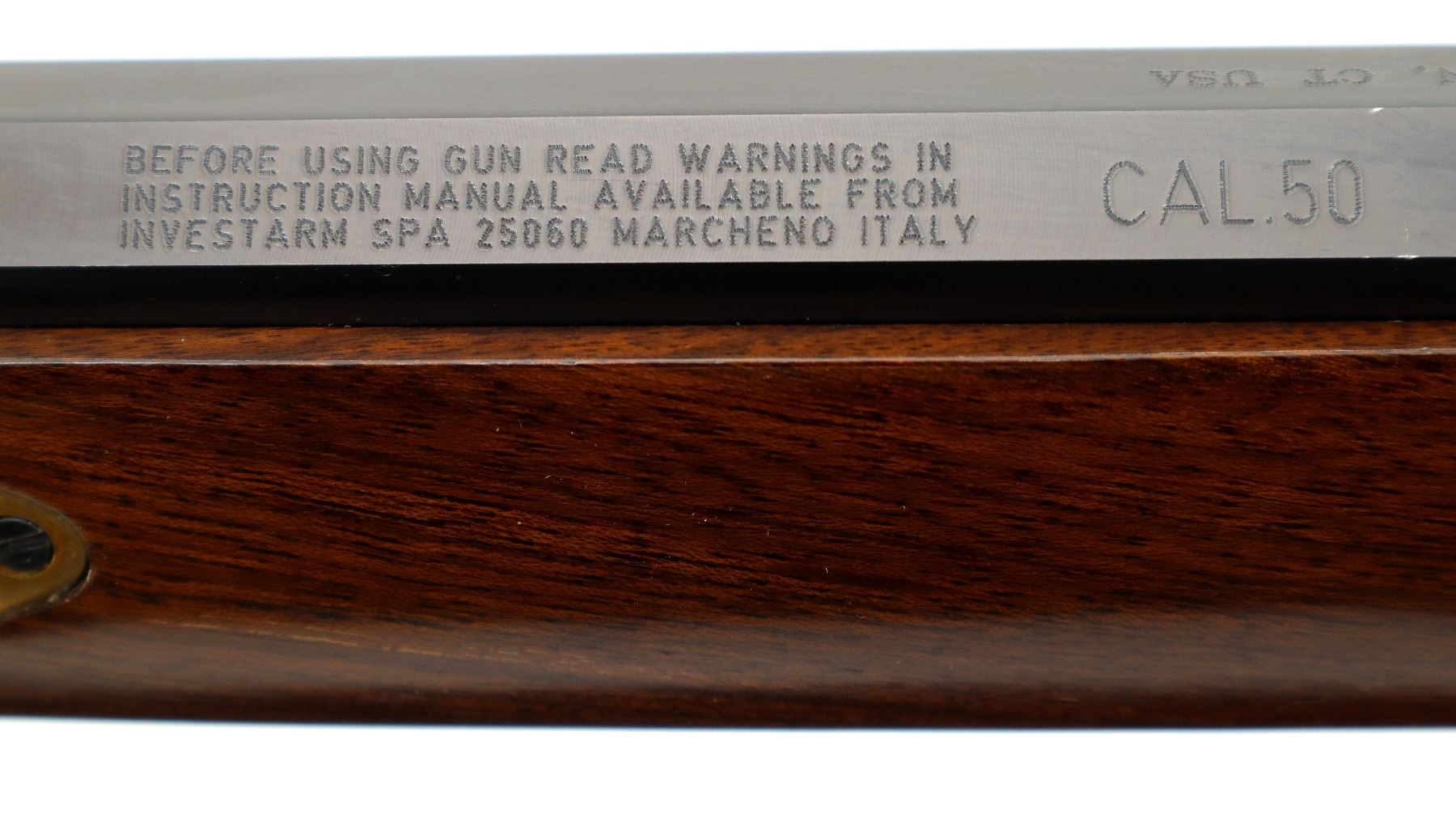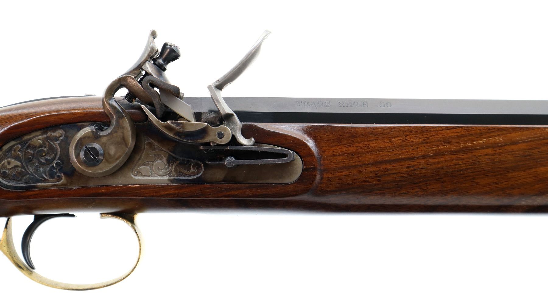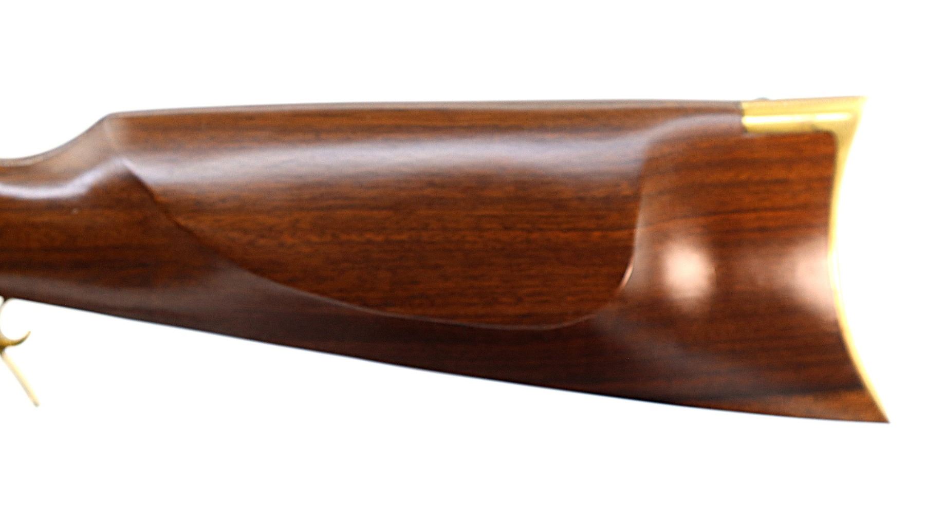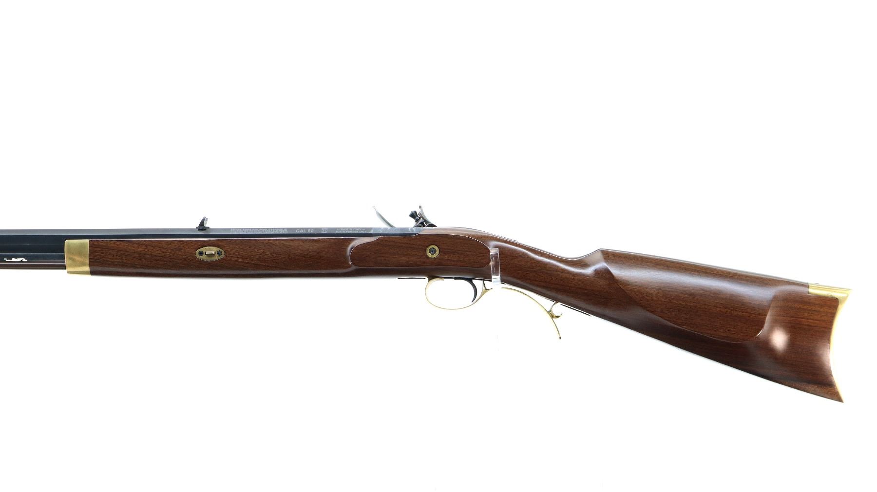 Main Description: Blade front sight, u notched rear sight, blued octagon barrel, engraved colour case hardened lock with hammer and frizzen that function. One piece half length wood stock, single forearm wedge, straight grip, cheek rest, smooth curved brass butt plate, finger rest trigger guard and nose cap, brown polymer ramrod with brass tip.