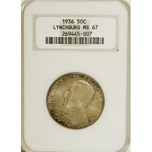 <B>1936 50C Lynchburg MS67 NGC.</B></I> On the delightfully toned reverse of this Lynchburg half, Liberty stands before the town courthouse, arms outstretched. That side has gold and violet-gray patina, while blue-green, gray, and yellow toning appears on the obverse. Pleasing luster shines beneath the colors.<BR><I>From The Cary & Cheryl Porter Collection.</B></I><BR><BR><b>Shipping:</b> Coins & Currency (<a target="_blank" href="http://www.heritageauctions.com/common/shipping.php">view shipping information</a>)