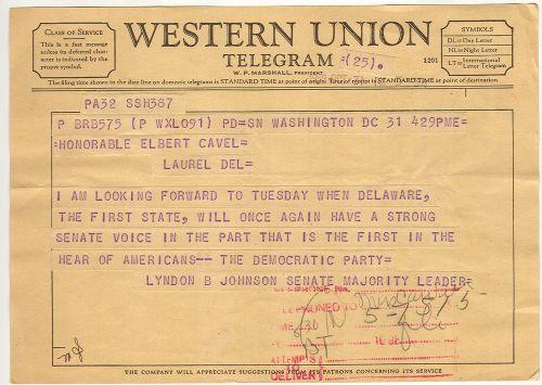 LYNDON B. JOHNSON ORIGINAL TELEGRAM. Western Union Telegram. October 31, 1958. Sent to Governor Elbert N. Carvel (Governor of Delaware 1949-1953, 1961-1965) and reads "I am looking forward to Tuesday when Delaware, the First State, will once again have a strong Senate voice in the part that is the first in the hear (sic) of Americans—The Democratic Party." Johnson is referring to Carvel's upcoming election for the U.S. Senate. Stamped at top "1958 Oct 31 PM 5:34". Delivery stamp and penciled writing at bottom. Initialed at bottom left "MJS". Shows some bending at top right corner. 8" x 5.75".