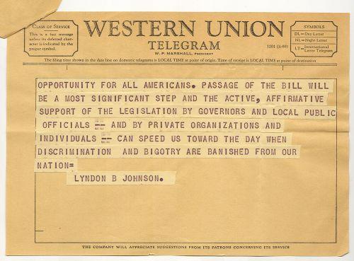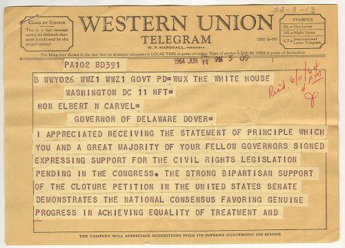 LYNDON B. JOHNSON ORIGINAL TELEGRAM. Two-page Western Union Telegram. June 11, 1964. Sent to Governor Elbert N. Carvel (Governor of Delaware 1949-1953, 1961-1965) and reads "I appreciate receiving the statement of principle which you and a great majority of your fellow governors signed expressing support for the Civil Rights Legislation pending in the Congress. The strong bipartisan support of the Cloture Petition in the United States Senate demonstrates the national consensus favoring genuine progress in achieving equality of treatment and opportunity for all Americans. Passage of the bill will be a most significant step and the active, affirmative support of the legislation by Governors and local public officials—and by private organizations and individuals—can speed us toward the day when discrimination and bigotry are banished from our nation." Stamped at top "1964 Jun 11 PM 3:09". Written in pencil at top right "22-3-13" and written in red ink at right "Rec'd. 6/11/64/4 PM/J". Both pages are stapled at top left corner. 8" x 5.75".