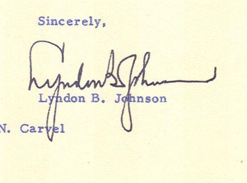 LYNDON B. JOHNSON TYPED LETTER SIGNED. Typed letter boldly signed "Lyndon B. Johnson" on 6" x 7" United States Senate Office of the Democratic Leader stationary, Washington, D.C., November 21, 1955. Note to Honorable Elbert N. Carvel (Governor of Delaware 1949-1953, 1961-1965) thanking him for a previous letter and addressing his attachment (not included) of 25 copies of the Legislative Report of the 84th Congress. Shows one faint diagonal fold mark.