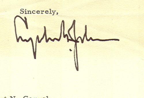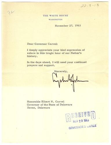 LYNDON B. JOHNSON TYPED LETTER SIGNED. Typed letter boldly signed "Lyndon B. Johnson" on 6.75" x 8.75" White House stationary, Washington, D.C., November 27, 1963. Note to Governor Elbert N. Carvel (Governor of Delaware 1949-1953, 1961-1965) extending his appreciation for his "kind expression of solace in this tragic hour of our Nation's history." Stamped at bottom right "Received/Nov 29, 1963/Governor's Office". Written in pencil at top right "22-3-13" and initialed in pen at top left corner "Fl". Shows some discoloration and some slight diagonal fold marks at center.