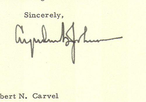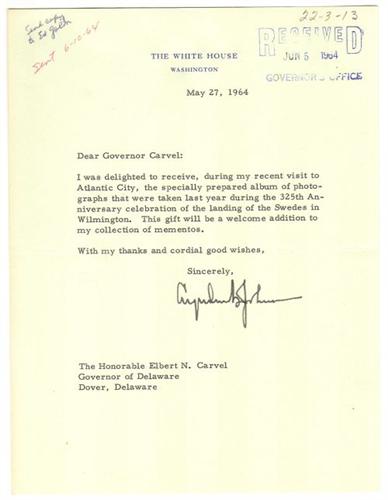 LYNDON B. JOHNSON TYPED LETTER SIGNED.  Typed letter boldly signed "Lyndon B. Johnson" on 6.75" x 8.75" White House stationary, Washington, D.C., May 27, 1964.  Note to Governor Elbert N. Carvel (Governor of Delaware 1949-1953, 1961-1965) expressing his appreciation in receiving a "specially prepared album of photographs that were taken last year during the 325th Anniversary celebration of the landing of the Swedes in Wilmington."  Stamped at top right "Received/Jun 5, 1964/Governor's Office".  Written in pencil at top right "22-3-13".  Written in black ink at top left "Send copy/to Ed Golin" and written in red ink beneath "Sent 6-10-64".