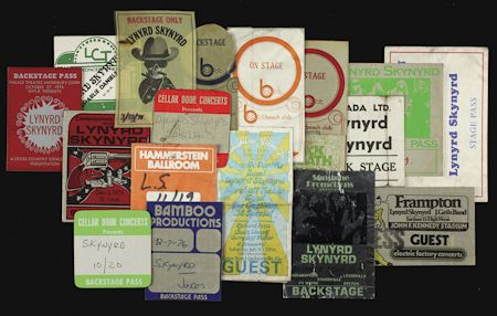Primarily from 1975-77, an outstanding array of fabric backstage passes from throughout the U.S., including: Lakeland Oct. 18, 1977 ( the next to last concert prior to the plane crashed that took the lives of Ronnie Van Zandt, Steve and Cassie Gaines, and three others), St. Louis Dec. 3, 1976, five heartland cities summer '75, Tampa Aug. 16, 1975, JFK Stadium June 11, 1977, Waterbury, CT. Oct. 27, 1976, Gator Bowl Jacksonville, FL., 1976, Leroy Concert Theatre, Pawtucket, RI., Oct. 26, 1976, Mar. 23, 1976, three from unknown locales or dates, Lakeland Apr. 30, 1976 (distressed), July 25, 1976 (distressed), Sep. 5, 1975 (distressed). Most VG or better, 14 still have original backing.