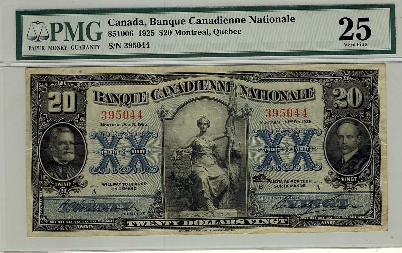 La Banque Canadienne Nationale, 1925 $20 #395044, CH-85-10-06, PMG VF25. Only 12 examples known. This is the second finest.
