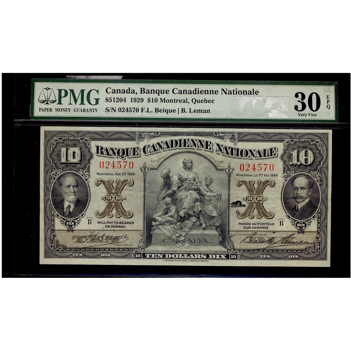 La Banque Canadienne Nationale 1929 $10 #024570 CH-85-12-04. PMG VF30EPQ. A very nice bright and clean example.