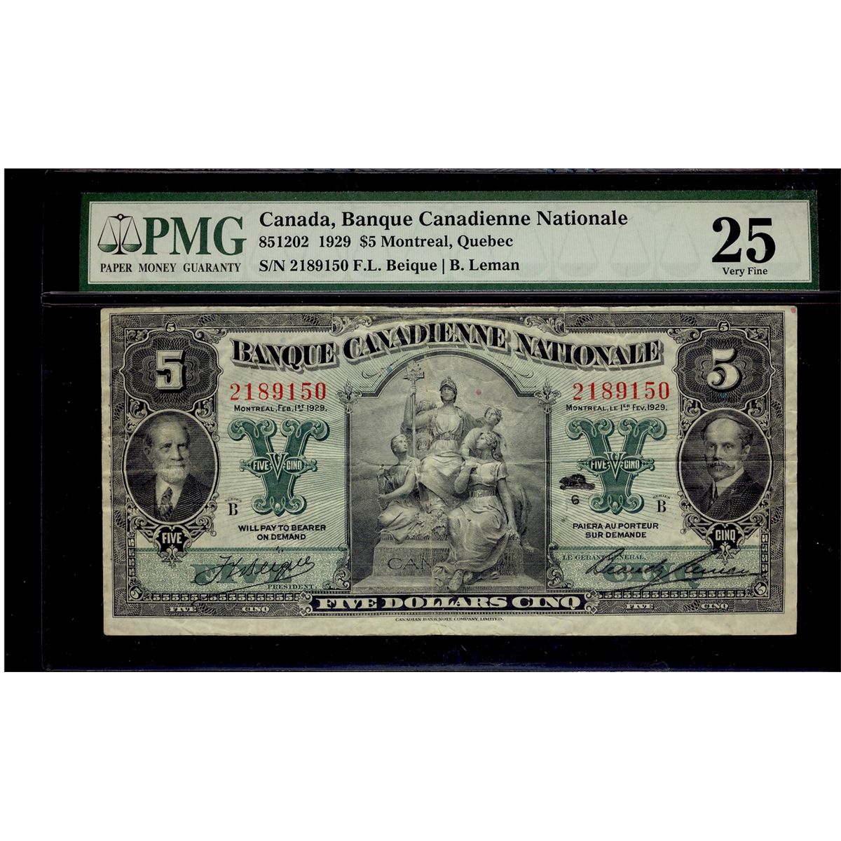 La Banque Canadienne Nationale 1929 $5 #2189150 CH-85-12-02 PMG VF25.