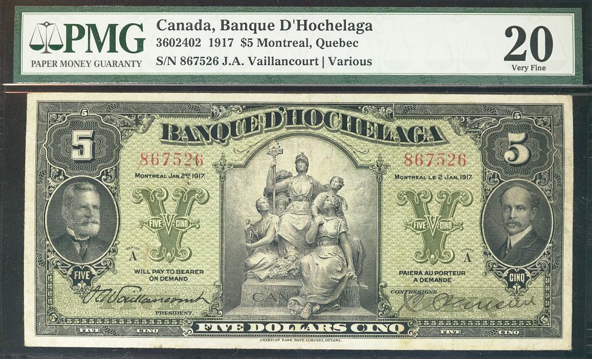 La Banque D'hochelaga 1917 $5 No.867526 CH-360-24-02 PMG VF20, nice a light stain on back