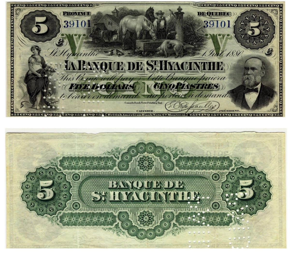 La Banque De St. Hyacinthe, 1880 $5 CH-645-12-02. Excessively rare issues, these notes have in most part all been redeemed and will show this with punch marks in the notes. This particular example shows two seperate punch marks.
