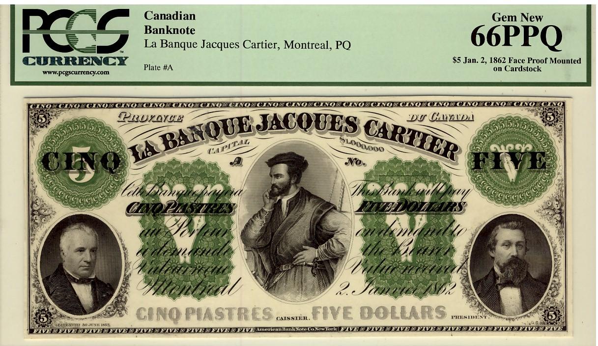 La Banque Jacques Cartier 1862 $5 CH-390-10-06P PCGS UNC66PPQ
