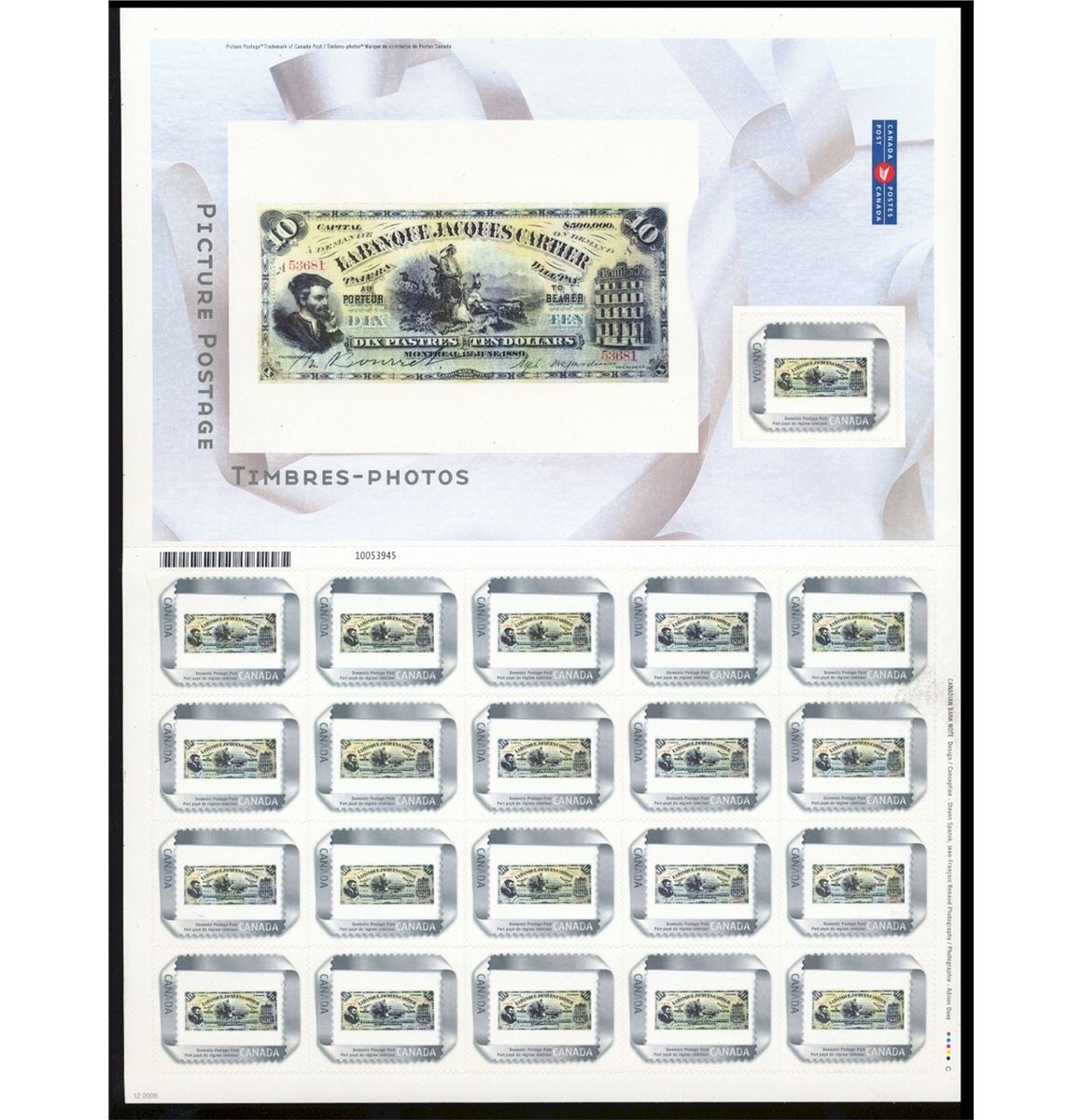 La Banque Jacques Cartier; Sheet of of 20 + 1 Postal Stamps portraying the actual Jacques Cartier 1889 $10 Note. This sheet comes in two parts, the bottom portion holds 20 stamps for postal purposes and the top portion holds larger portrait of the Banknote plus one postal stamp. According to our research only two of these sheets were issued.
