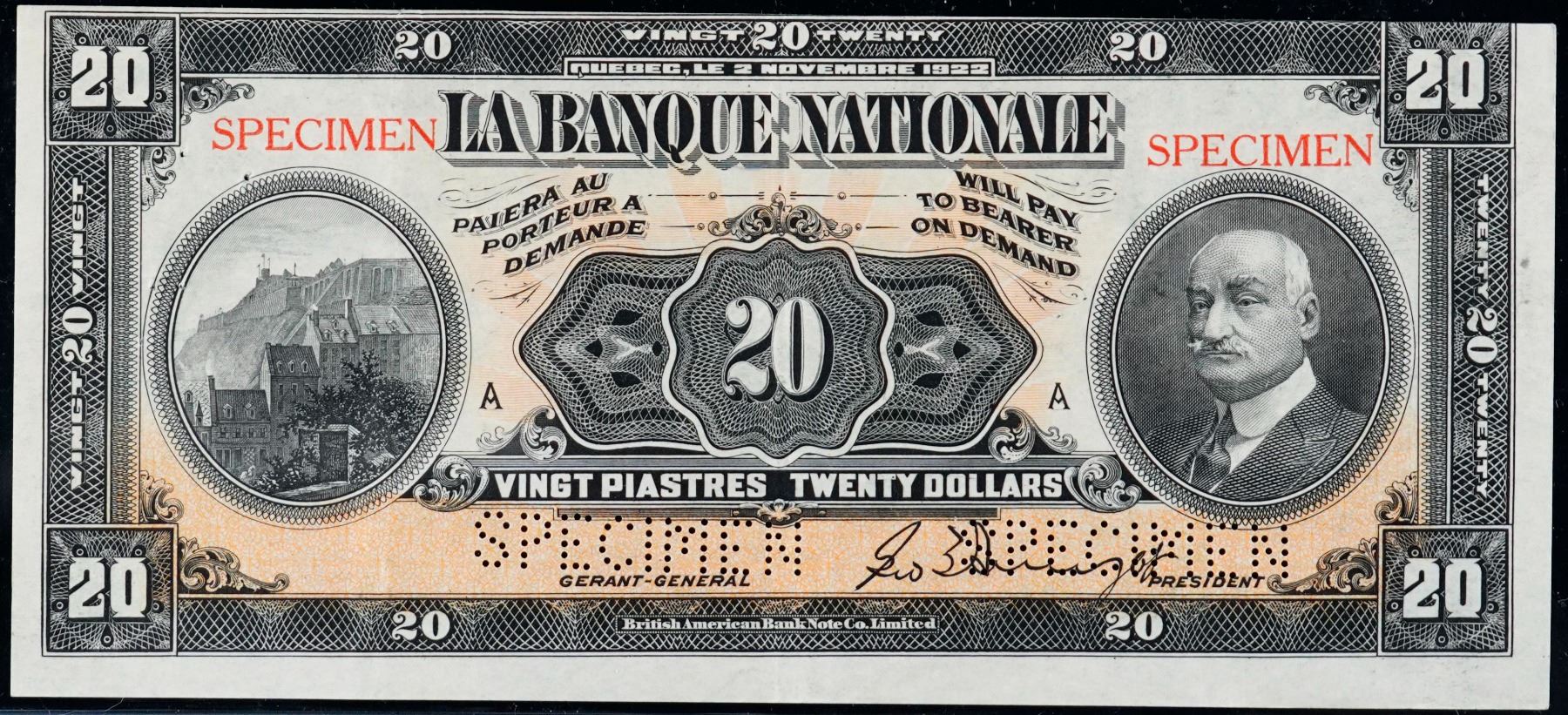 La Banque Nationale 1922 $20 CH-510-22-06S "Specimen" EF , a bit miscut.
