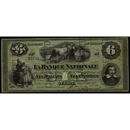La Banque Nationale May, 28 1870 $6 CH-510-12-06. No.05753/A. Punch cancelled four times in body of note. A bright Very Fine. Very rare and sought after.