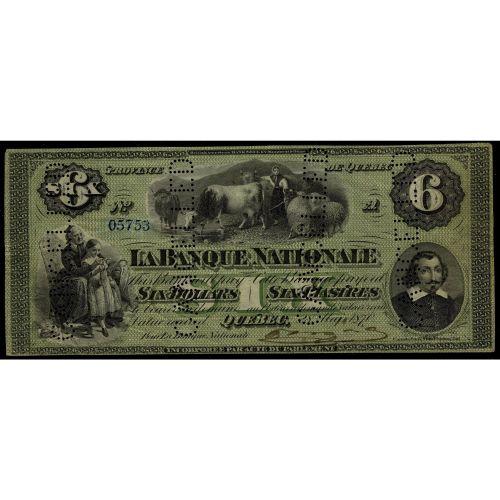 La Banque Nationale May, 28 1870 $6 CH-510-12-06. No.05753/A. Punch cancelled four times in body of note. A bright Very Fine. Very rare and sought after.