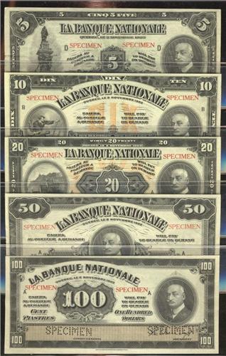 La Banque Nationale, complete specimen set dated 1922 . Includes $5, $10, $20, $50 and $100. All notes are perforated "Specimen" twice. Original AU-UNC.